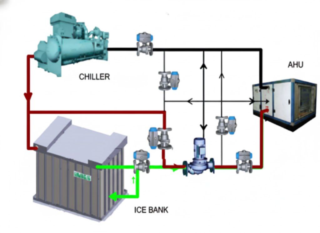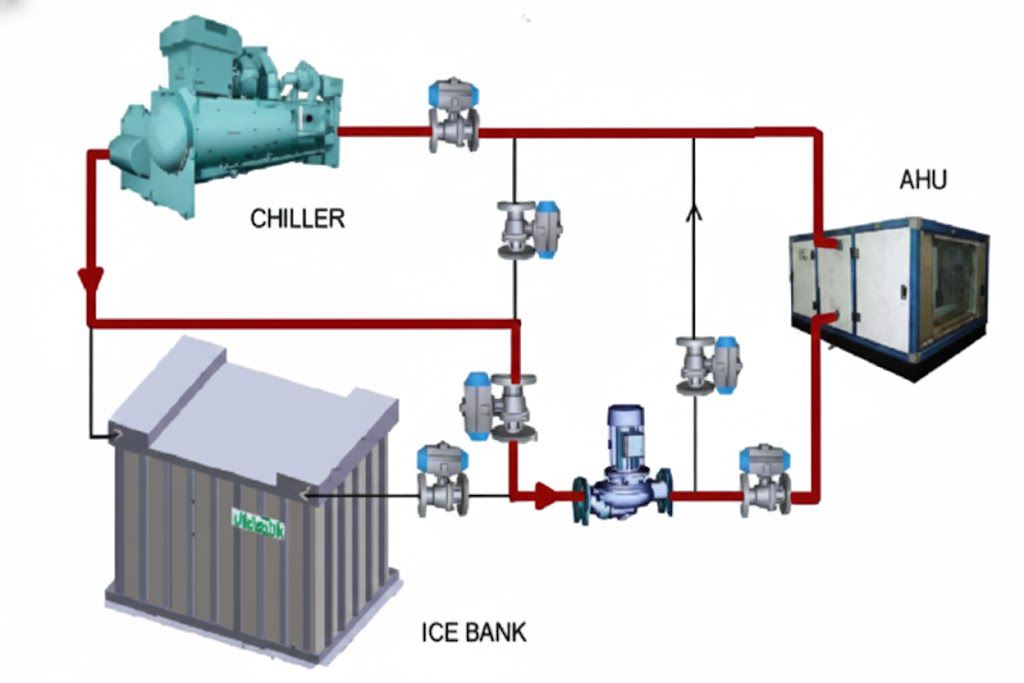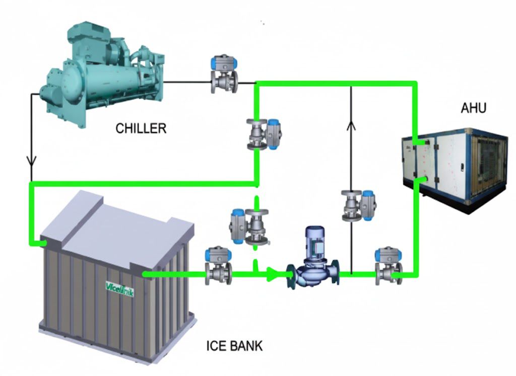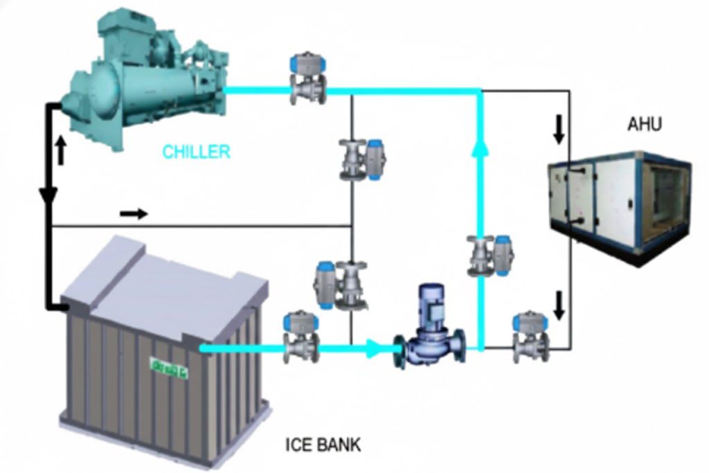 充電(Charge):冷熱の製造と貯蔵。低負荷時に、チラーはグリコール溶液を-4oCまで冷却します。この溶液がコイル内を流れ、周囲の水を凍結させ、冷熱エネルギーを貯蔵します。